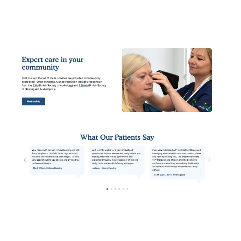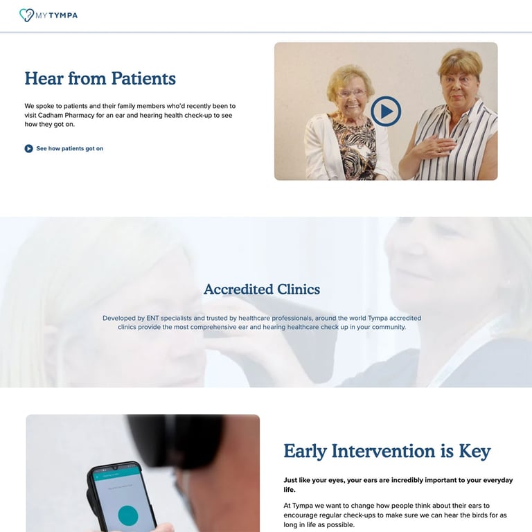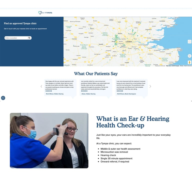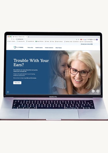 Approach: After identifying a confusing lead generation form, I designed two user pathways: a streamlined customer support area and a patient-facing site with a clinic finder and accessible advice on common hearing issues.